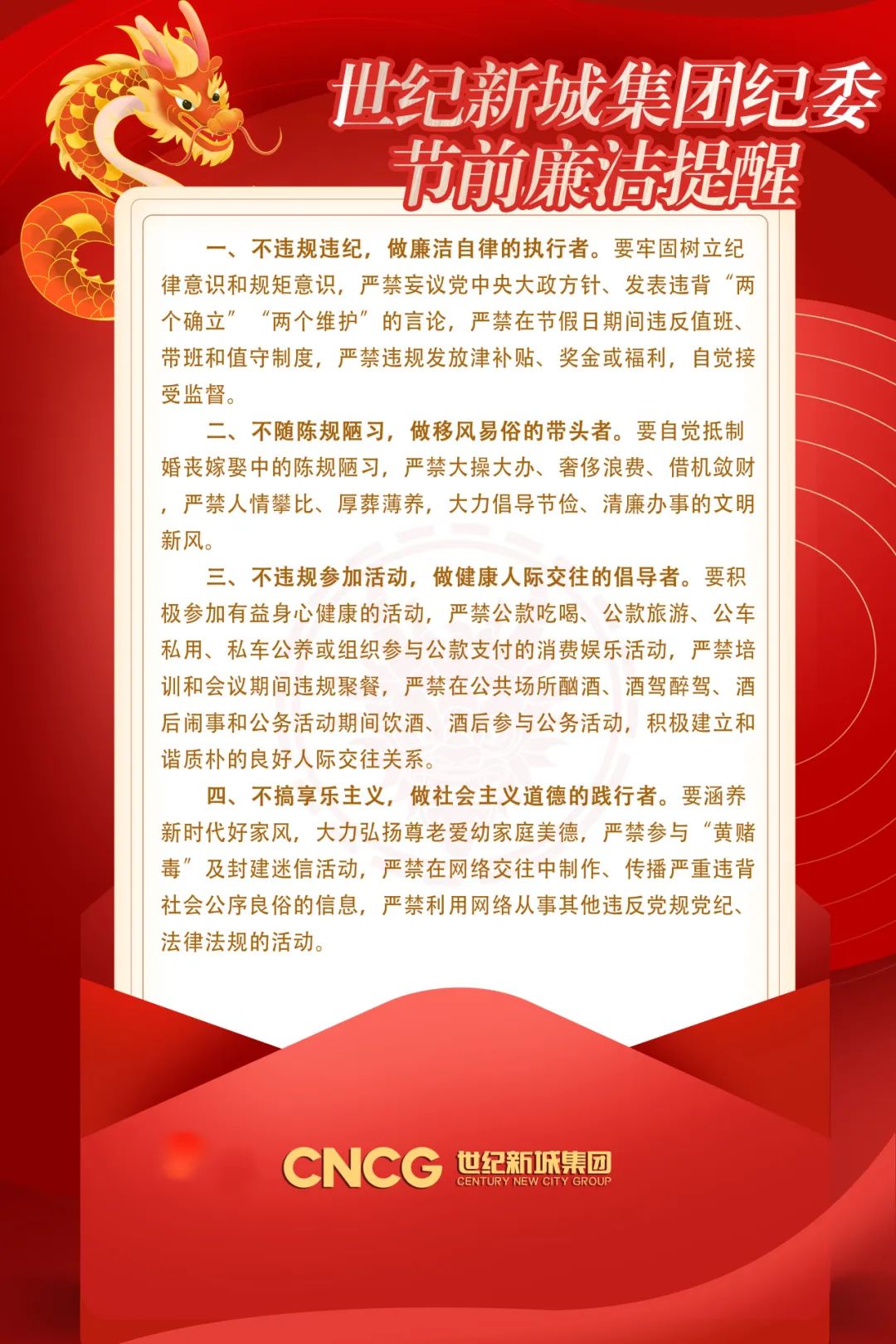 春節(jié)將至,世紀新城集團紀委向您和您的家人致以誠摯的問候和美好的祝福。為深化落實中央八項規(guī)定精神,營造風清氣正、文明祥和的節(jié)日氛圍,這份廉潔提醒請您收好: