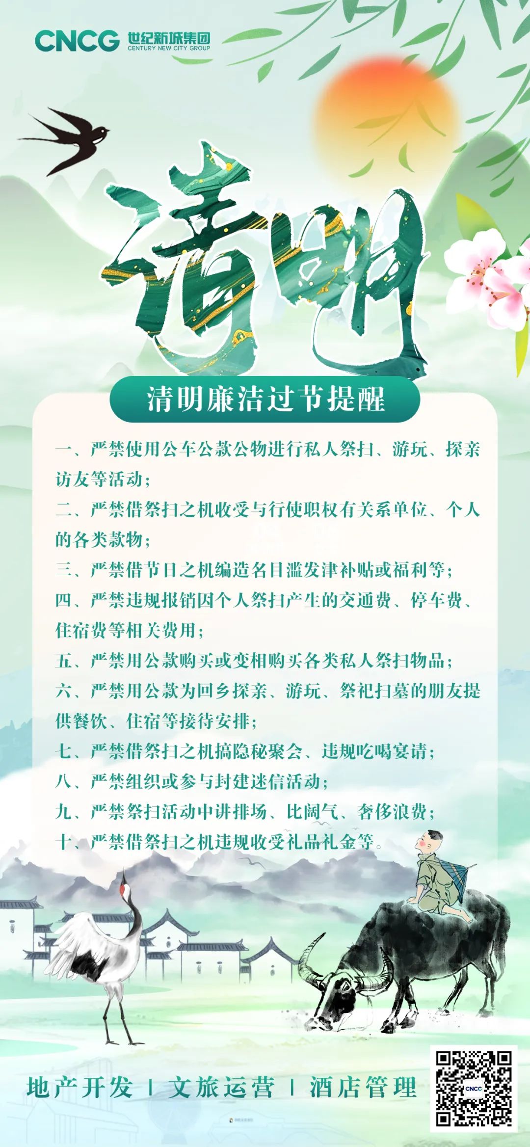又是一年春草綠,又到一年清明時(shí)。清明節(jié)是中華民族緬懷英烈、悼念先人、寄托哀思、傳承文化的傳統(tǒng)節(jié)日。為鍥而不舍落實(shí)中央八項(xiàng)規(guī)定精神,嚴(yán)防“四風(fēng)”回潮反彈,江蘇世紀(jì)新城集團(tuán)紀(jì)委溫馨提醒全體干部職工要自覺(jué)把好“廉潔關(guān)”,時(shí)刻繃緊紀(jì)律規(guī)矩之弦,文明低碳祭掃,弘揚(yáng)新風(fēng)正氣,讓清明之節(jié)更“清明”。特發(fā)出如下倡議: