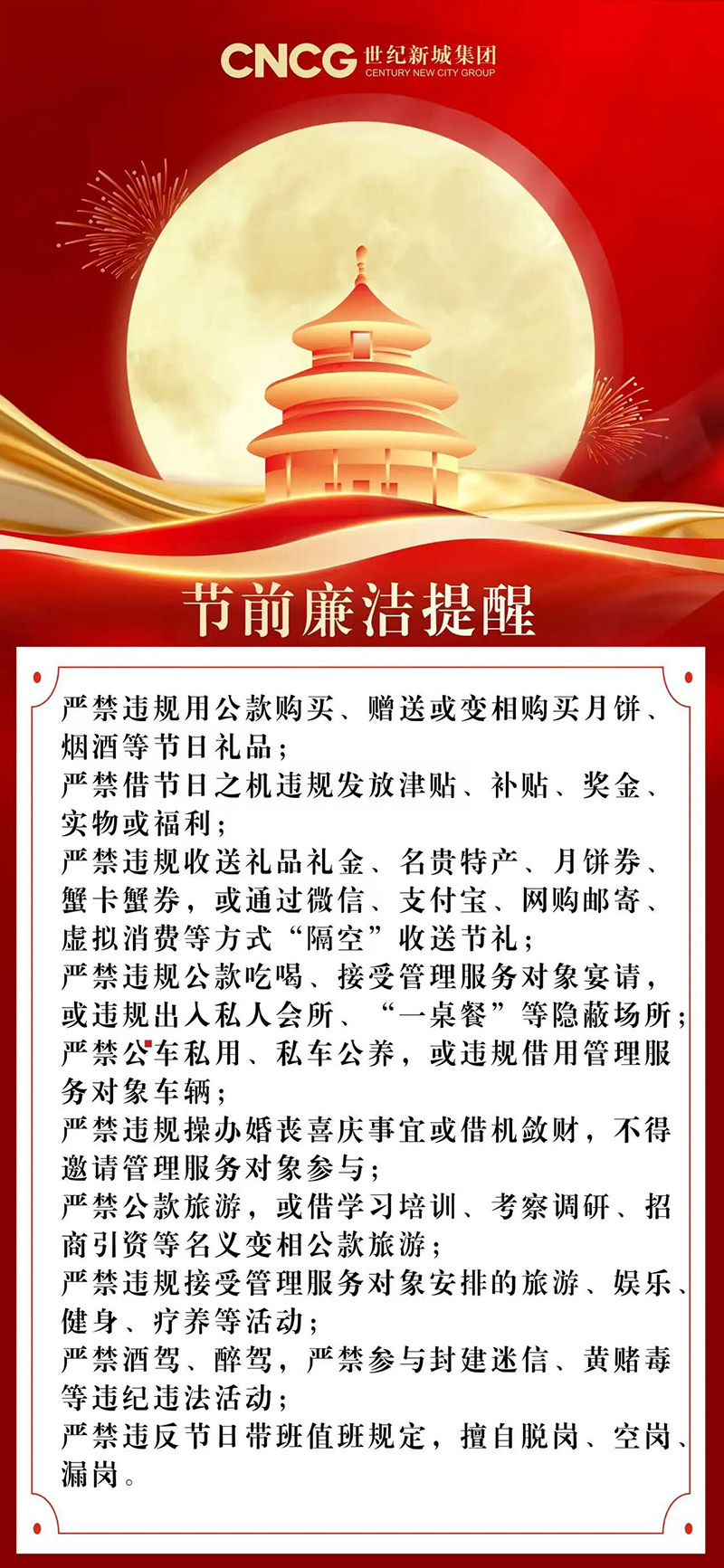 清風伴佳節(jié),廉潔守初心,2025年國慶、中秋“雙節(jié)”將至,為持續(xù)推進作風建設常態(tài)化長效化,馳而不息糾“四風”樹新風,營造風清氣正的節(jié)日氛圍,世紀新城集團紀委提醒全體黨員干部職工:守紀律、明底線、知敬畏,時刻繃緊紀律規(guī)矩這根弦,讓節(jié)日清風常駐、正氣長存。