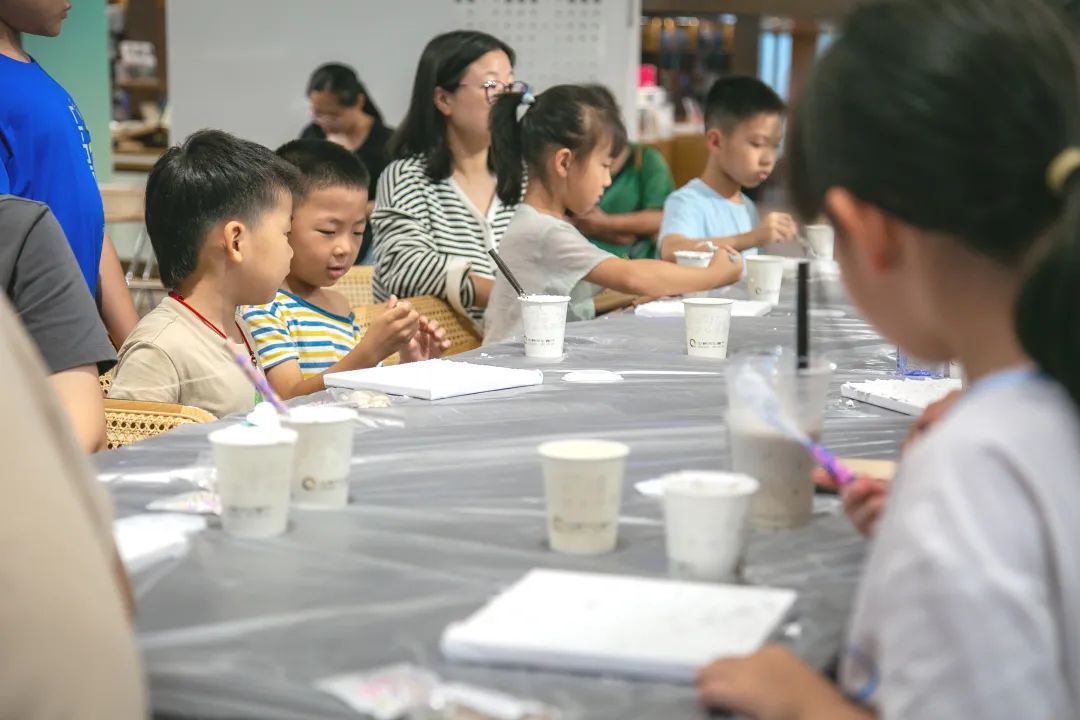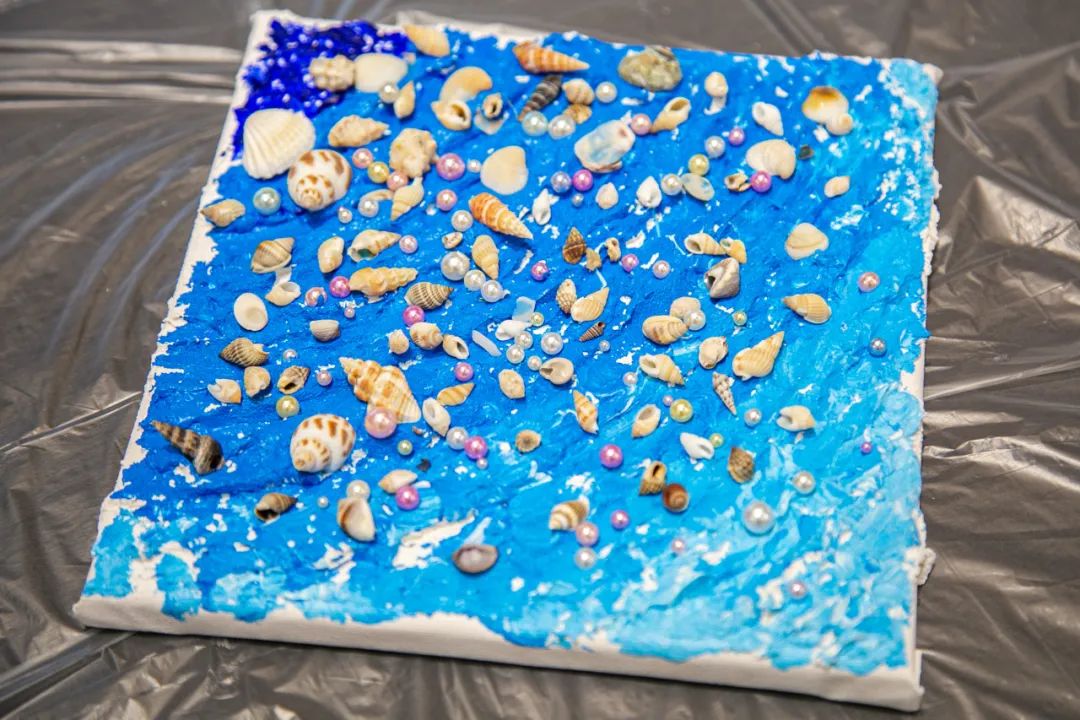 大家構(gòu)思分布海浪的結(jié)構(gòu)和位置,小心翼翼的用鉛筆在畫(huà)板上畫(huà)出大致輪廓,再將石英砂混入丙烯顏料增加肌理感。小巧的刮刀變成了靈活的畫(huà)筆,大家用不同手法“刮”出各種縱橫交錯(cuò)、凹凸不平的紋理,最后再搭配上貝殼以及珍珠裝飾,一幅幅精美獨(dú)特的作品由此誕生。