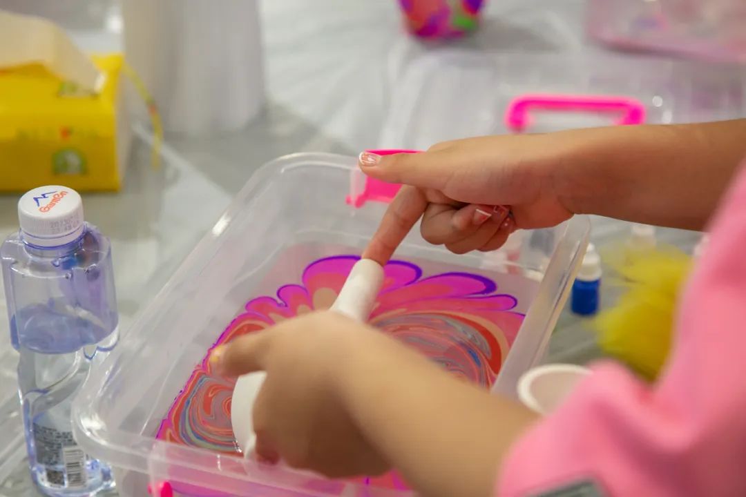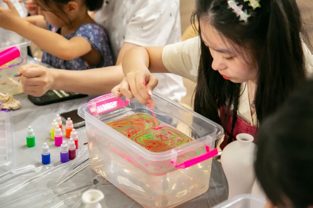 活動(dòng)現(xiàn)場(chǎng),志愿者向大家介紹水拓畫(huà)和水拓花瓶的知識(shí)并進(jìn)行演示制作,30組家庭在志愿者的指導(dǎo)下動(dòng)手制作,倒水、挑色、作畫(huà)、覆瓶,在輕松歡樂(lè)的氛圍中,一幅幅色彩斑斕的水拓畫(huà)浮于水面,一只只獨(dú)一無(wú)二的水拓花瓶立于臺(tái)上。孩子們?cè)诨顒?dòng)中學(xué)習(xí)并感受水拓技術(shù)的魅力,進(jìn)一步激發(fā)了創(chuàng)造力和想象力,也促進(jìn)了親子間的互動(dòng)與協(xié)作,讓成長(zhǎng)更有“溫度”。