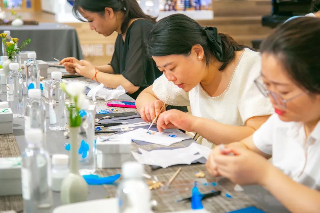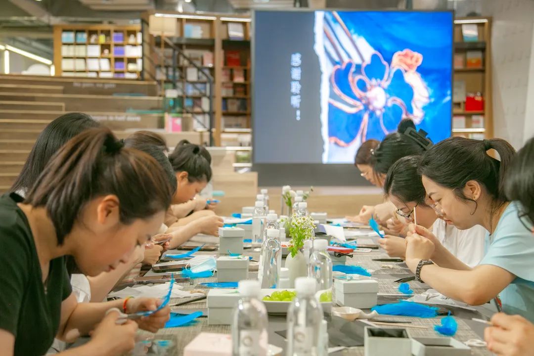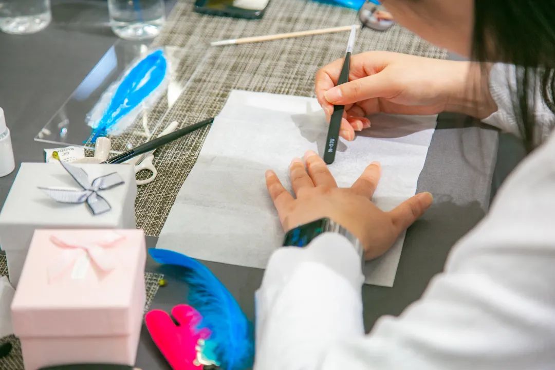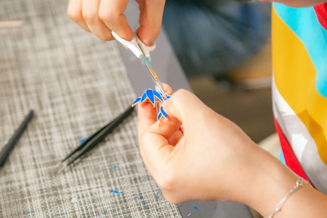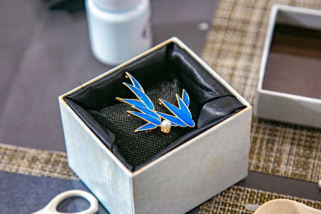 平穩(wěn)的案板,端方的紙筆,精細(xì)的工具,大家在歡聲笑語中,邊學(xué)邊做邊交流,描、剪、填、粘、鑲......每個步驟都大家全神貫注、小心翼翼、精益求精,好像一位位技藝嫻熟的工匠。不一會兒,巧手“工匠”們精心制作的點翠胸針就完成了,在紛繁復(fù)雜的工藝之下,一件件精美的作品宛若一只只翩然起舞的藍(lán)蝶、展翅欲飛的青鳥,凝結(jié)著大家勞動的愉悅和美的創(chuàng)造,大家在完成作品的同時,對傳統(tǒng)非遺文化點翠技藝也有了更深的感知。