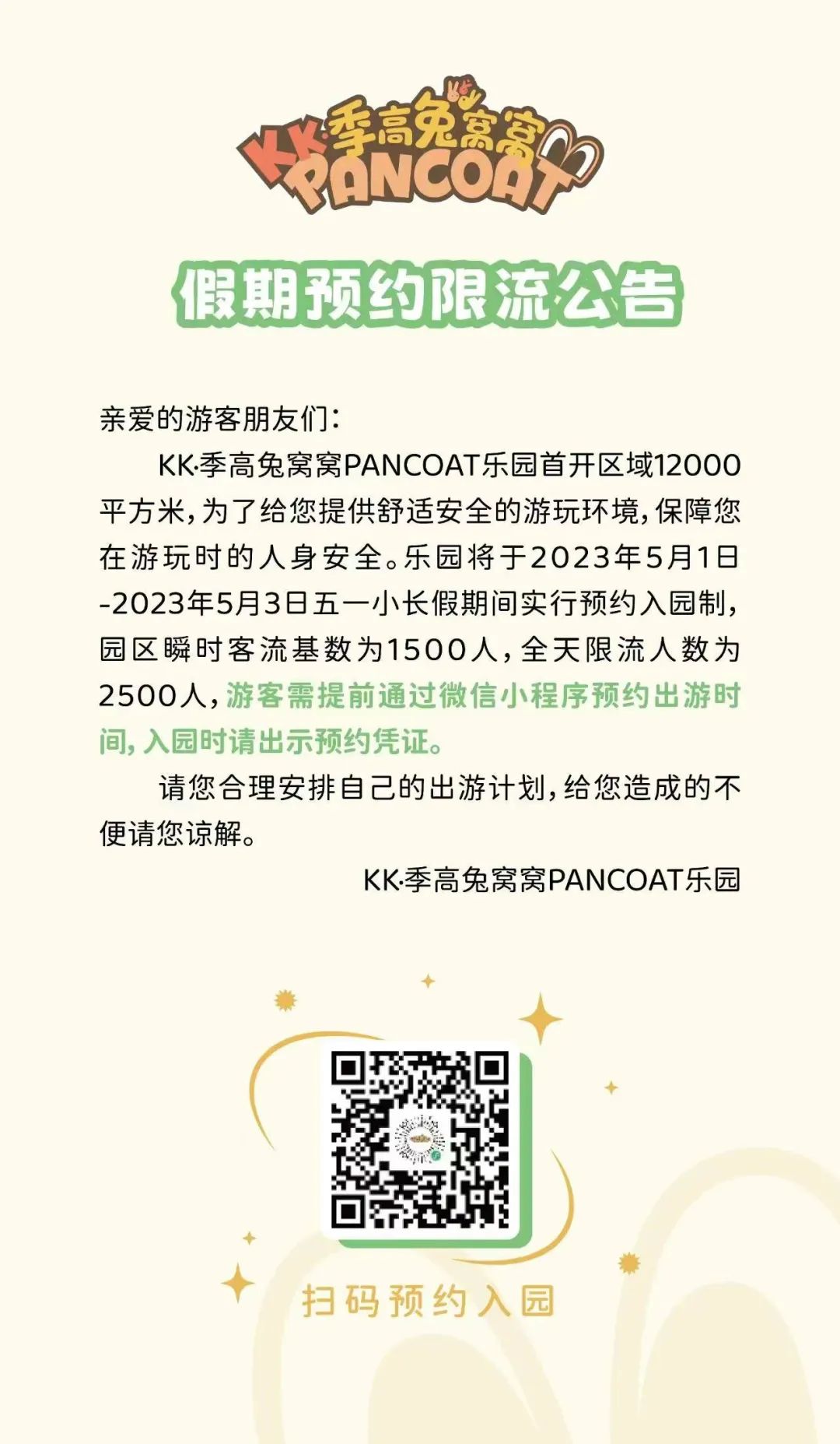 特別注意:開園火爆,5月1日-3日,KK·季高兔窩窩PANCOAT樂園全天限流人數(shù)為2500人,入園需出示預(yù)約憑證。
