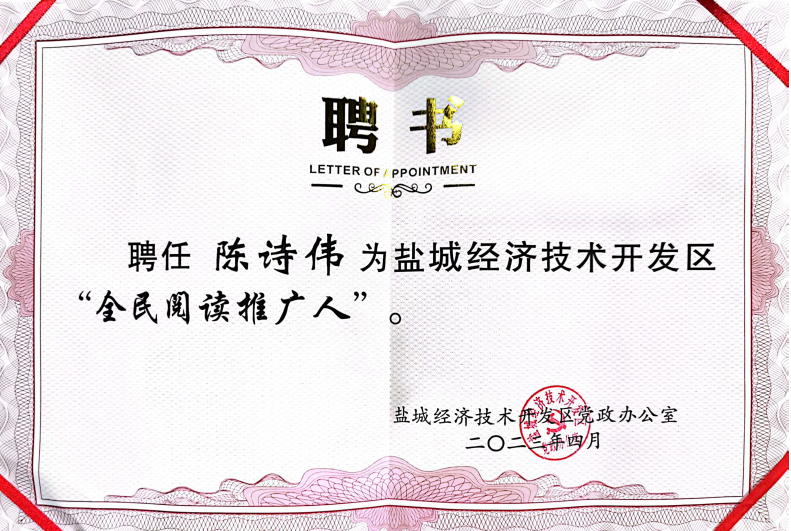 近日,集團(tuán)新嘉源“融書閣”榮獲2022年度鹽城市全民閱讀“十百千萬”工程優(yōu)秀典型——十佳閱讀空間、經(jīng)開區(qū)“優(yōu)秀閱讀空間”;中韓文化客廳“廳見”青年讀書匯獲評經(jīng)開區(qū)“優(yōu)秀閱讀組織”;中韓文化客廳店長、“廳見”青年讀書匯負(fù)責(zé)人陳詩偉被聘為經(jīng)開區(qū)“全民閱讀推廣人”。