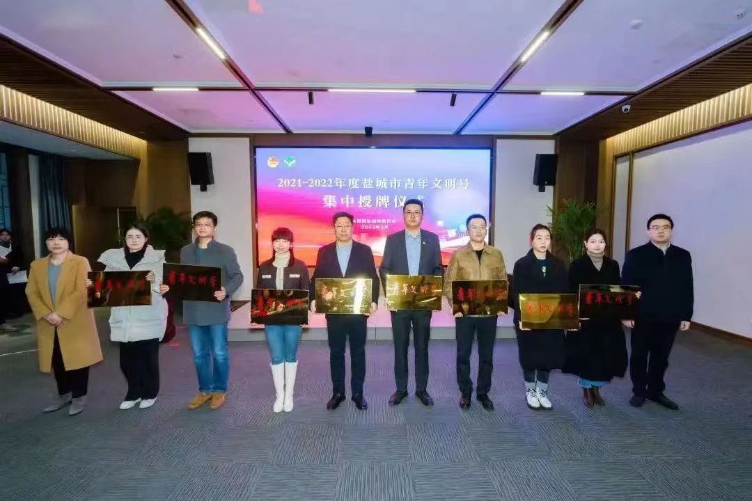(圖為2021-2022年度鹽城市“青年文明號”集中授牌儀式,右五為地產(chǎn)公司工程部)