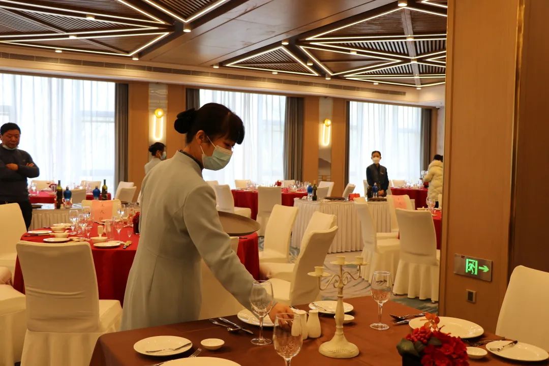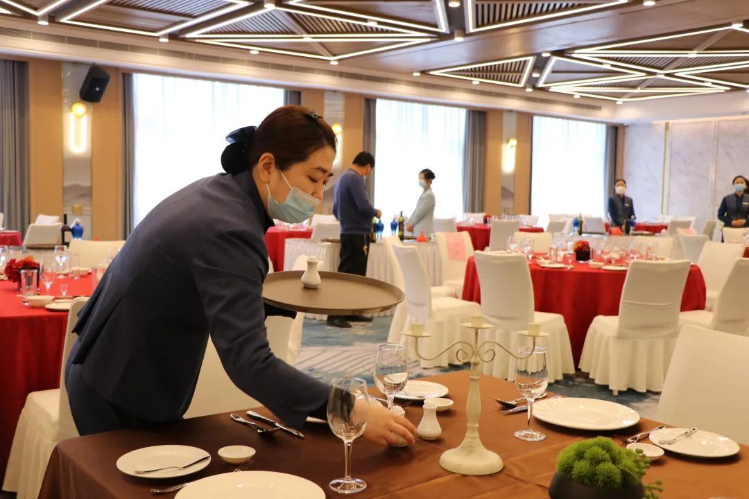 “一張10人臺的餐桌,碗、勺、筷、碟、酒杯等需在17分鐘內(nèi)按規(guī)范擺好;餐碟、筷子尾距桌邊1.5CM餐具,間距1CM。”32名員工正在中韓商匯三樓大廳進行緊張的現(xiàn)場實操考試,由3名考評員、2名現(xiàn)場督導、1名餐飲業(yè)指導老師組成的考評團,在現(xiàn)場仔細觀察員工們的操作。“餐廳服務員的技能等級共有五級,按國家規(guī)定,每級均有相應的待遇,級別越高待遇越好。”酒店公司總經(jīng)理丁正東說道,這是2023年首次開考的餐廳服務四級職業(yè)技能等級認定考試,考試內(nèi)容分為筆試、實操、口試等環(huán)節(jié),考試內(nèi)容為餐飲服務中關(guān)于宴會服務、顧客服務等相關(guān)服務技能,有理論考試也有實操考試,均參照國家職業(yè)資格證書考核標準進行考核認定。
