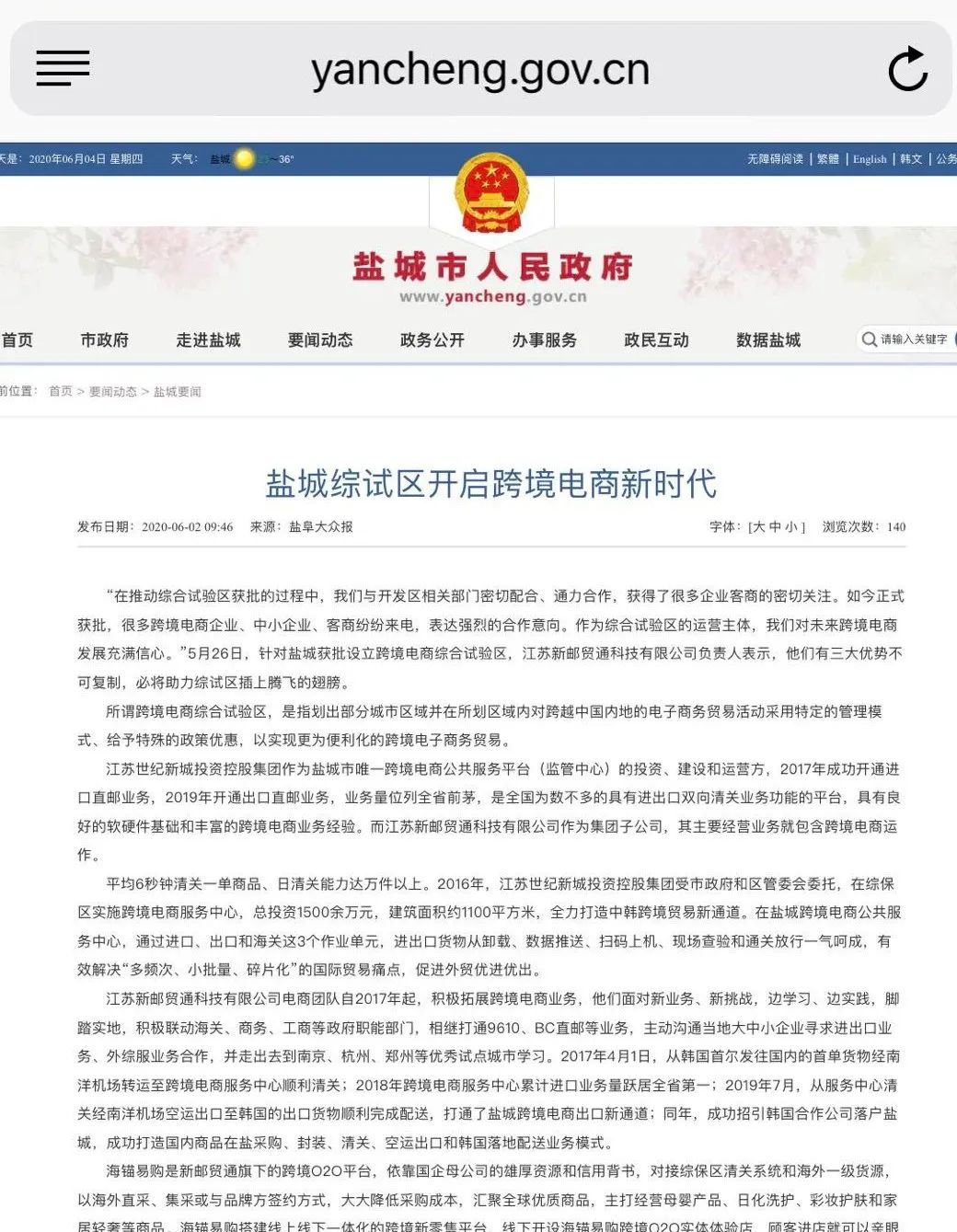 近日,“學(xué)習(xí)強(qiáng)國”APP、中共江蘇省委新聞網(wǎng)、鹽城市人民政府網(wǎng)站、鹽阜大眾報(bào)等多家主流媒體報(bào)道鹽城跨境電商“綜試區(qū)”。