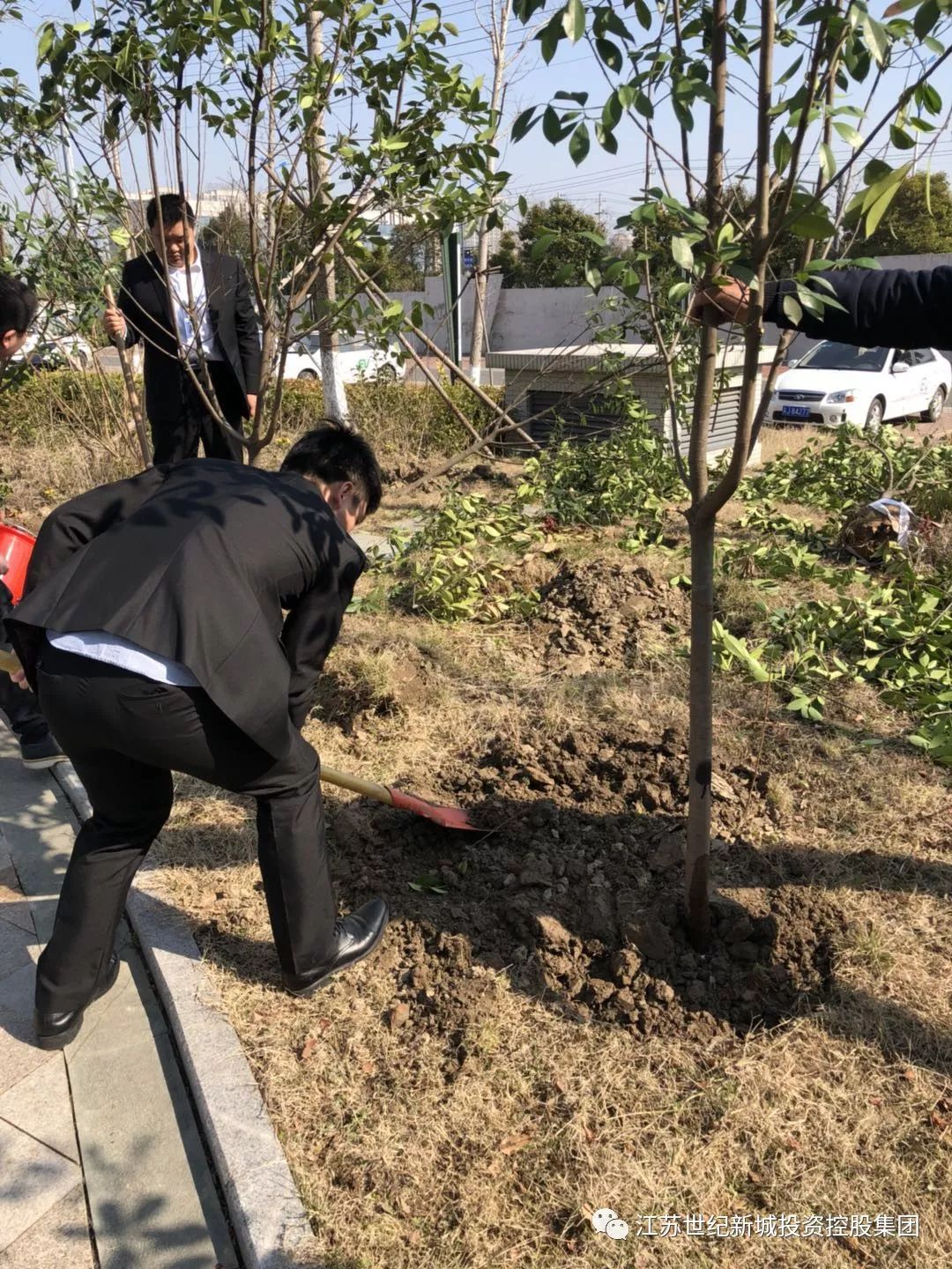 植樹活動現(xiàn)場,參加植樹的員工進行挖坑、放樹苗、扶樹、填土、澆水、蓋土,每個人都忙得不亦樂乎。經(jīng)過兩個多小時的勞動,20棵綠樹在廣場“安家落戶”,為新嘉源公寓添上了一片新綠。