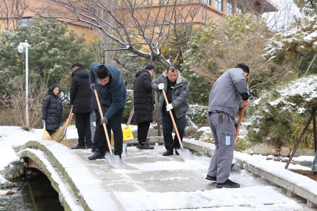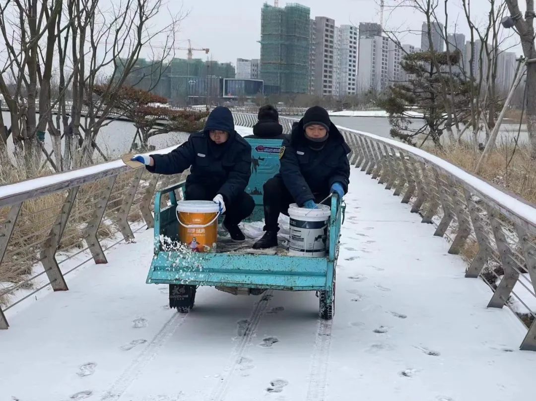 在東湖國際、東大門KK-PARK、中韓迎賓苑、中韓文化客廳、新嘉源人才公寓等項目現(xiàn)場,大家個個干勁十足,清雪現(xiàn)場熱火朝天,鏟雪除冰行動有序地開展著。針對部分區(qū)域積雪厚、清理難的實際,大家分工負責,先清后鏟,再撒鹽......大家鏟的鏟,撒的撒,配合默契,忙碌的身影,構成了一道靚麗的風景線。