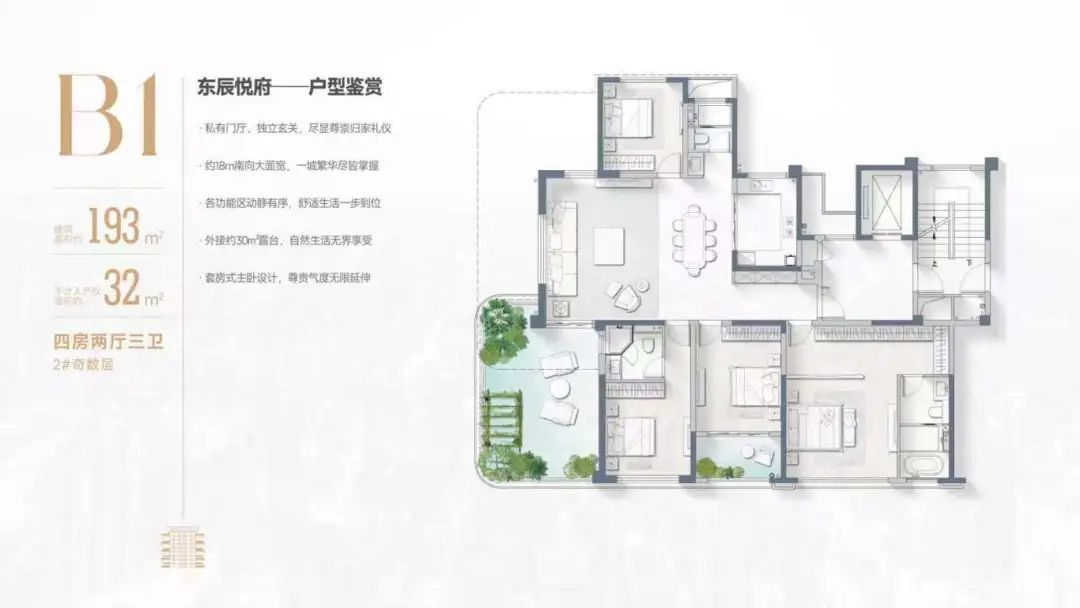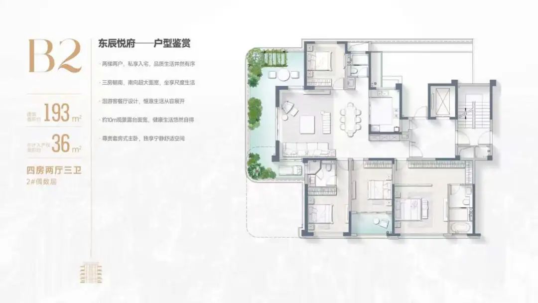 東辰悅府采用奇偶錯層設(shè)計,以約193㎡B1戶型為例,4室2廳3衛(wèi)的全維度生活場景,約3.15米的挑高,約18米南向全景采光面,南北通透。獨立電梯入戶,生活優(yōu)雅從容。外拓約30㎡露臺,既有“院落”的閑適,也有“大平層”的采光通透性,創(chuàng)造出更加豐富的生活方式。未來,這里是運動健身、親子互動的家庭樂園,也可以是商務(wù)會談、茶歇聚會的待客空間,也可以是侍花弄草、品茗賞景的自在天地,讓住宅為日常生活提供“回歸自然”的情緒價值。