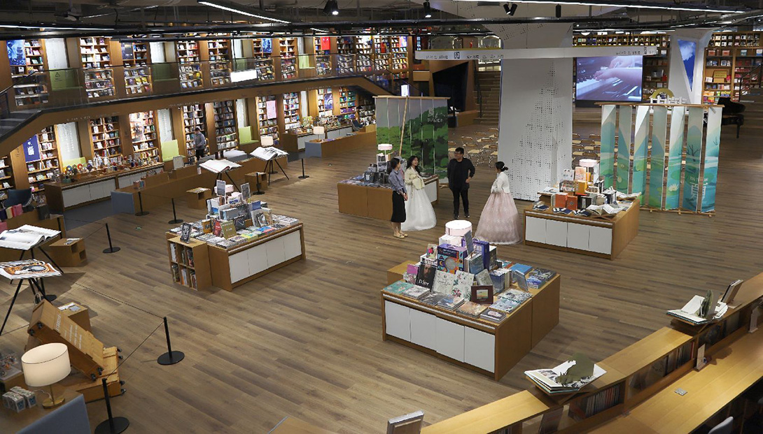 客廳以促進(jìn)中韓文化交流為導(dǎo)向,引入優(yōu)秀文化藝術(shù)資源的同時(shí),不斷發(fā)酵本土文化元素,致力形成獨(dú)具特色的城市文化印象點(diǎn)。店內(nèi)藏書約40種共約15萬冊,以文學(xué)、藝術(shù)、人文社科以及少兒圖書為主,融合文創(chuàng)、咖啡、輕食、生活、休閑于一體,風(fēng)格各不相同,活動(dòng)空間充裕。一層復(fù)合式圖書綜合館約5400平方米,分為城市書房、階梯書墻、閱讀新知、藝術(shù)書區(qū)、中心活動(dòng)區(qū)、紅色書區(qū)、外國專家書屋、創(chuàng)意文具區(qū)、韓國生活市集、咖啡區(qū)、親子空間、親子餐廳、秘密花園等14個(gè)功能區(qū)域。5.6米巨幕書墻讓讀者置身于鱗次櫛比的書架間,徜徉于知識海洋。紅色書區(qū)以紅色文化為主線,開設(shè)習(xí)近平新時(shí)代中國特色社會主義思想專題展柜。藝術(shù)書區(qū)匯集國內(nèi)外150多家出版社、藝術(shù)機(jī)構(gòu)出版品,展陳藝術(shù)裝置“永不落幕的展覽”大書展。中心書區(qū)創(chuàng)新“閱讀+體驗(yàn)”運(yùn)營模式,集合自助閱讀、交流分享、文化活動(dòng)等多種功能。除一層精品圖書外,二層藝術(shù)空間、三層主題餐廳還提供文創(chuàng)產(chǎn)品、親子閱讀、輕食餐飲等生活體驗(yàn),讓閱讀空間的內(nèi)涵更加多元化。