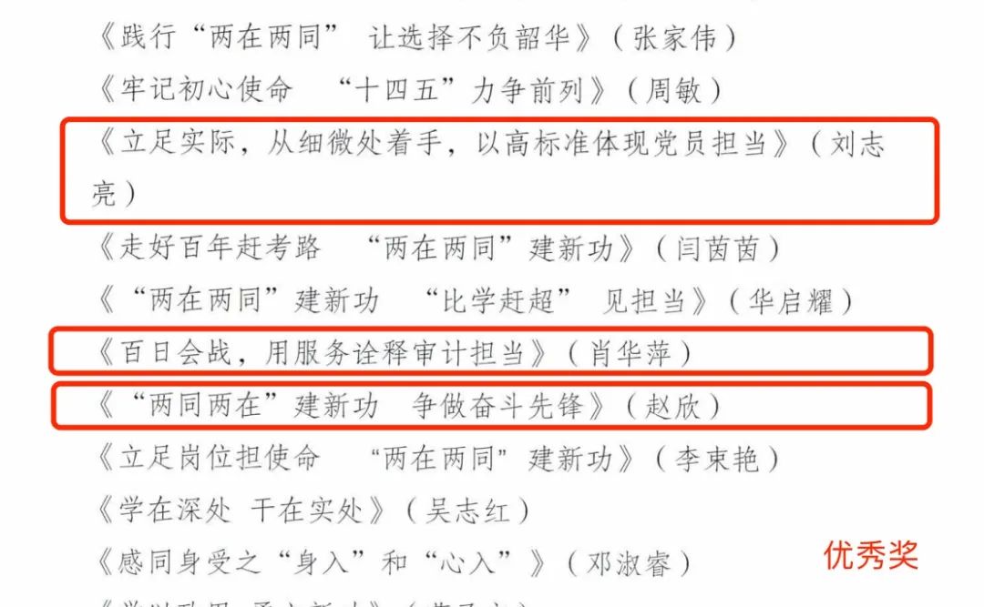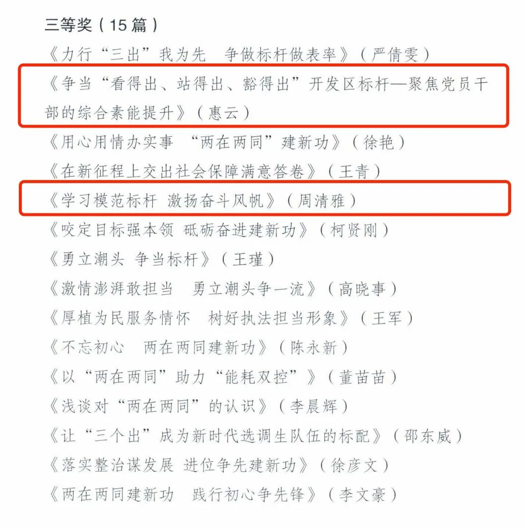 本次獲獎(jiǎng)作品中:集團(tuán)紀(jì)委趙斌作品《生逢其時(shí)自當(dāng)勇立潮頭奮揖揚(yáng)帆矢志不負(fù)青春》榮獲一等獎(jiǎng),地產(chǎn)公司惠云作品《爭當(dāng)“看得出、站得出、豁得出”開發(fā)區(qū)標(biāo)桿一聚焦黨員干部的綜合素能提升》、融資部周清雅作品《學(xué)習(xí)模范標(biāo)桿激揚(yáng)奮斗風(fēng)帆》榮獲三等獎(jiǎng),審計(jì)部肖華萍作品《百日會(huì)戰(zhàn),用服務(wù)論釋審計(jì)擔(dān)當(dāng)》、財(cái)務(wù)部劉志亮作品《立足實(shí)際,從細(xì)微處著手,以高標(biāo)準(zhǔn)體現(xiàn)黨員擔(dān)當(dāng)》、招標(biāo)部趙欣作品《“兩同兩在”建新功,爭做奮斗先鋒》榮獲優(yōu)秀獎(jiǎng)。